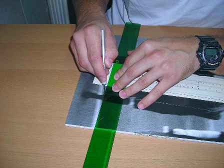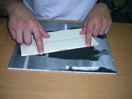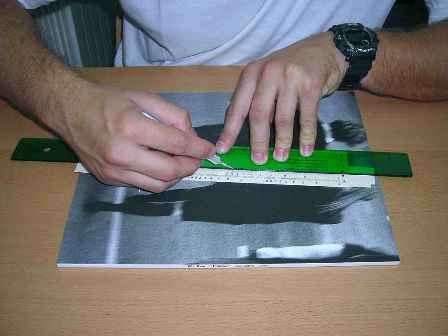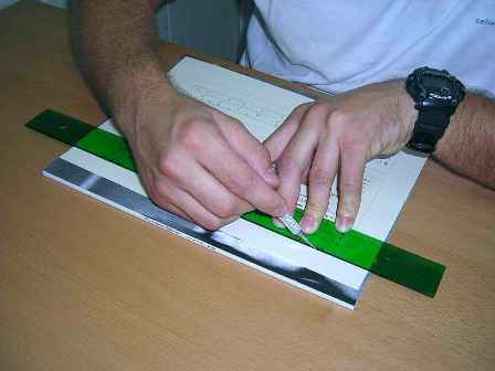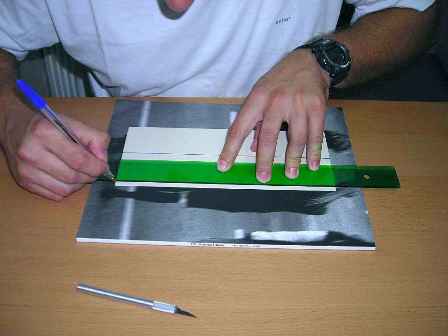 16. Trazar una línea 4mm por encima de la que viene impresa en la cartulina, para emplearla después como zona de corte (una de las líneas impresas en la cartulina no está bien colocada). |