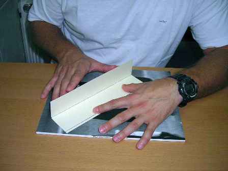 5. Por el dorso trazar con un bolígrafo dos líneas, que facilitarán el doblado de la cartulina por las líneas discontinuas. |