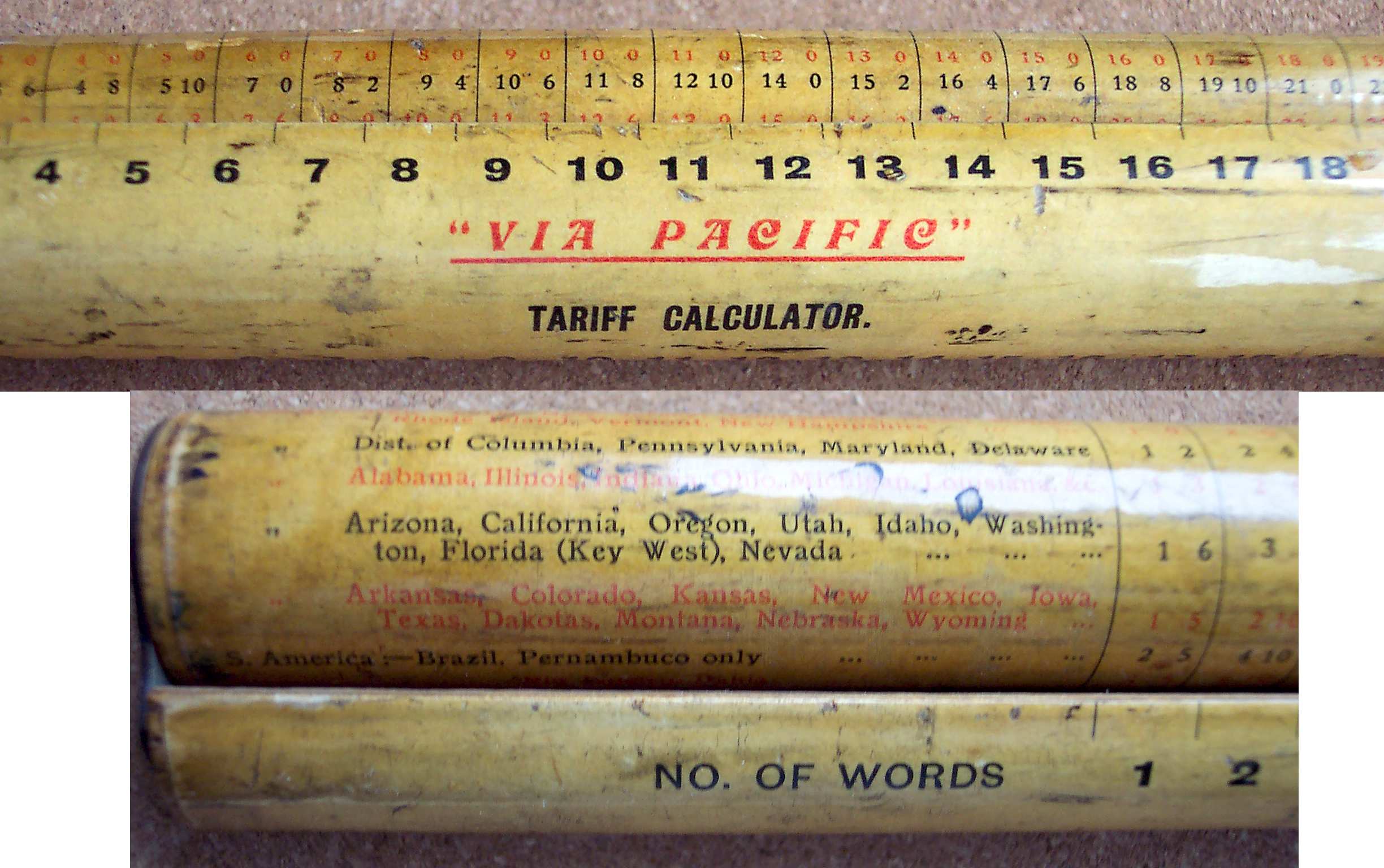 La varilla central tiene grabado el multiplicador (2 a 50), el multiplicando en este caso es 76, el resultado se lee a la izquierda de la varilla central. Una manivela (no se ve en la foto) permite girar los rodillos que soportan la tela donde están grabados los números que hay que multiplicar (color rojo) y los resultados (amarillo y blanco).