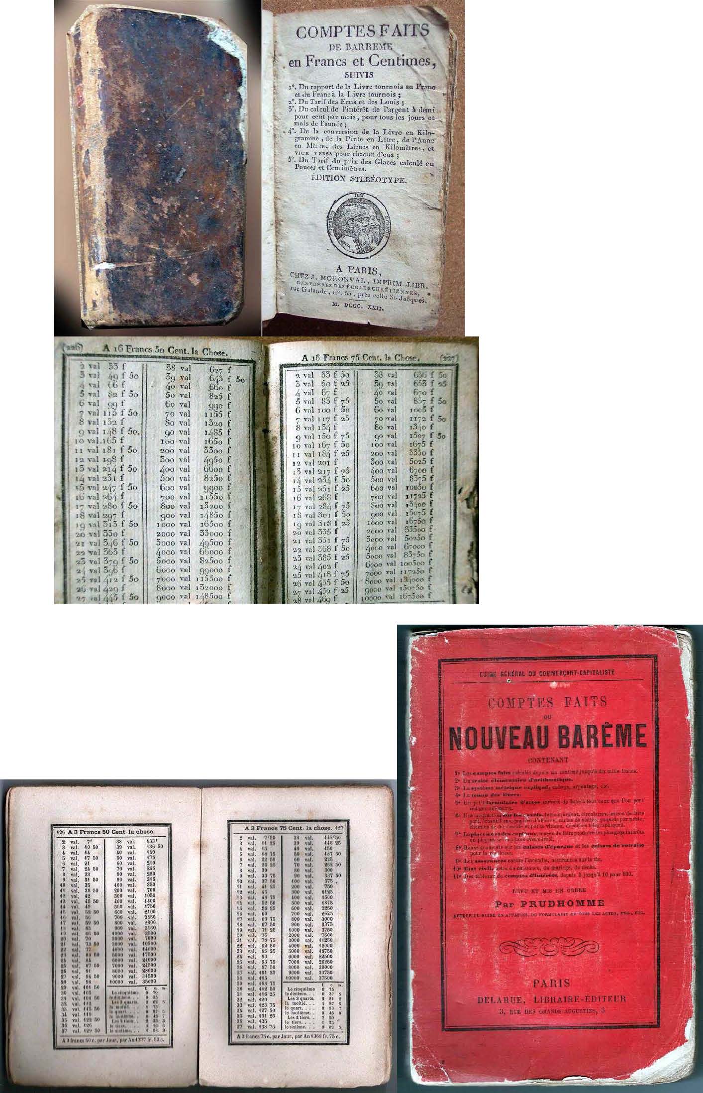 El personaje clave es François BARREME (1634-1703) que editó por primera vez en 1669 un manual de “cuentas hechas”; su hijo continuó su obra; estos manuales han sido re-editados muchísimas veces, la palabra “baremo” es originaria de este apellido BARREME; eran muy populares y en su forma de bolsillo utilizado por los mercaderes en las ferias, mercados de pueblo, etc. Los mas interesantes son los anteriores al sistema métrico, las tablas daban el resultado directo del valor de 1 a 100 “cosas” por el precio de la “cosa” (en estas tablas el precio cubría todos los valores posibles de la moneda en uso con sus múltiplos y sub múltiplos..).