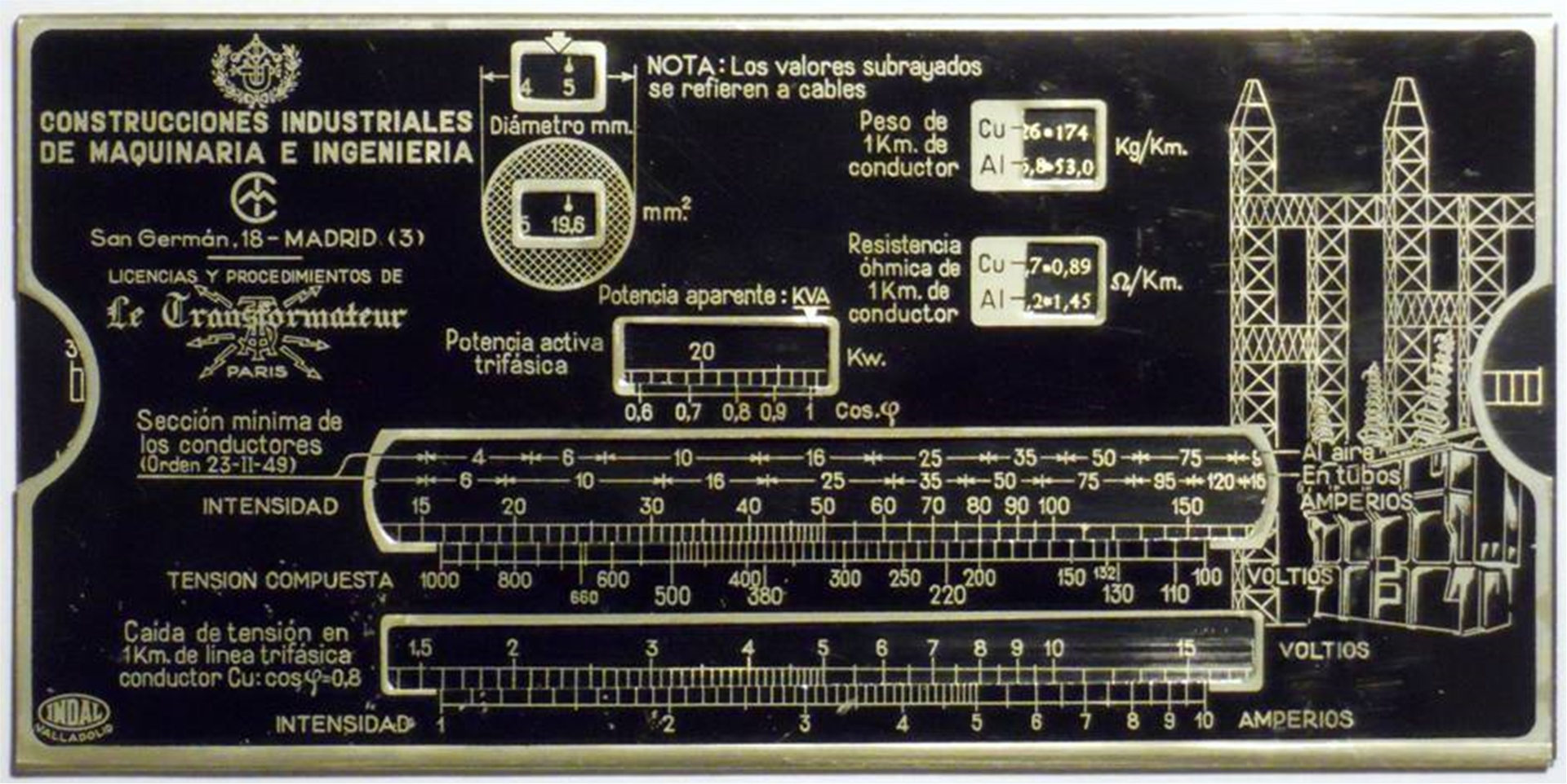 | Escalas: | (diámetro a peso/km) / (potencia) / (cosφ) / (sección mín), (intensidad) / (tensión) / (voltios) / (amperios) |