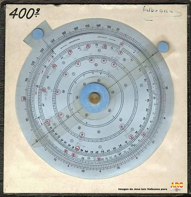 | Tipo: | RCs, reglilla en cuarto de círculo con escalas circulares. Dos nomogramas (ábaco 1 y 2) |