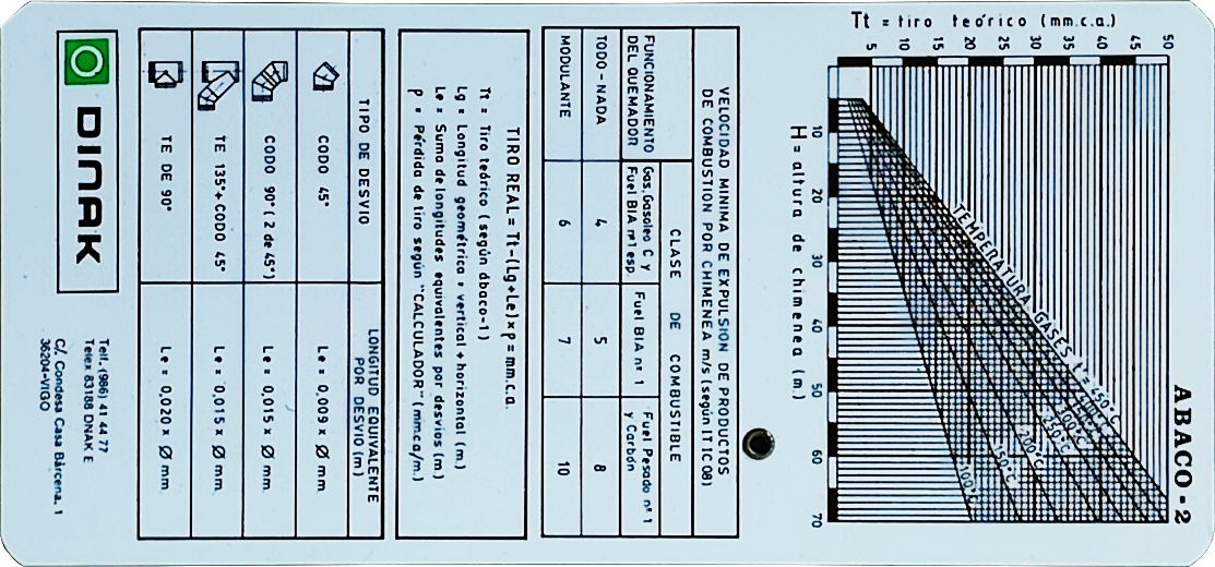 | Escalas: | Específicas para cálculos de dimensionado de chimeneas (diámetro, altura). En el reverso tabla con fórmulas y equivalentes de tramos especiales. |