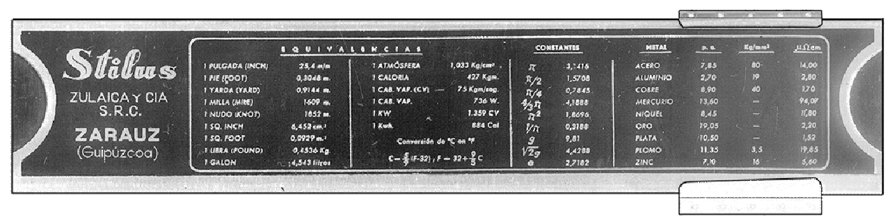 | Se trata de un modelo de propaganda fabricado por Indal con propaganda de la fábrica Zulaica de cajas de compases marca Stylus (ver información en el foro ARC). Indal (Industria Derivada del Aluminio) se fundó en 1950 como un taller dedicado a la fotoimpresión del aluminio, y las reglas de cálculo promocionales eran uno de los productos que ofrecían. Aunque no incluye el logo Indal, las grandes similitudes del diseño, y al estar hecha de aluminio, permiten asignarlo también a este fabricante. Por la estructura (ver modelo para Pérdidas de Carga en Conducciones de Agua) diría que se trata del primer diseño, luego vendría la V1 (más económica, en aluminio y con cursor todo de plástico) y acabaría con la V3 (toda de plástico). |