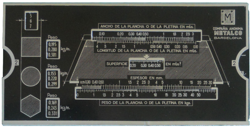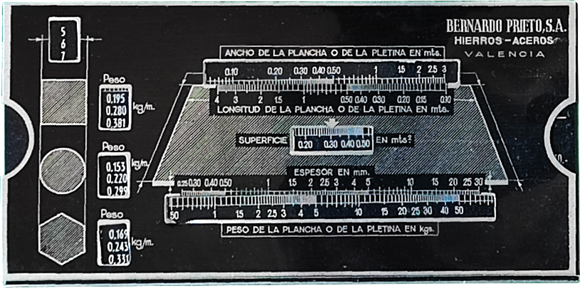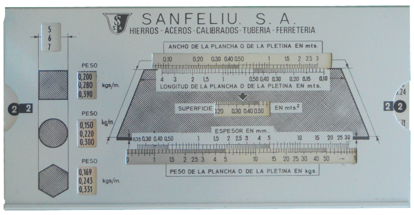 | Escalas: | Anverso: (ancho) / (longitud), (superficie) / (espesor) / (peso), (tabla selección peso varillas) reverso: (tabla de selección de pesos según perfiles) |