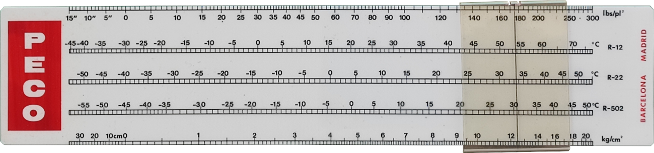 | Escalas: | Anverso: conversión entre temperatura agentes refrigerantes y presiones. Reverso: conversión entre ºC y ºF y presión agente refrigerante |