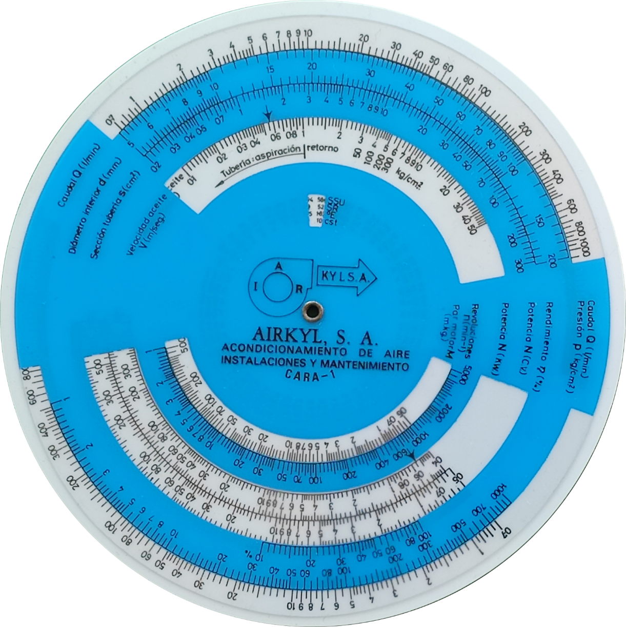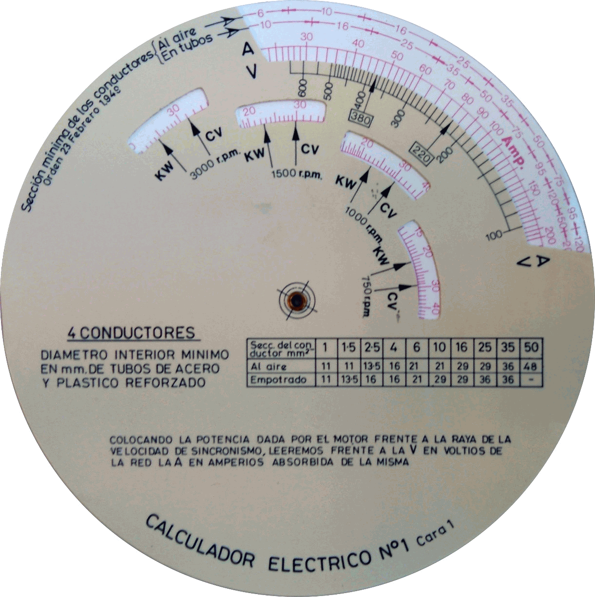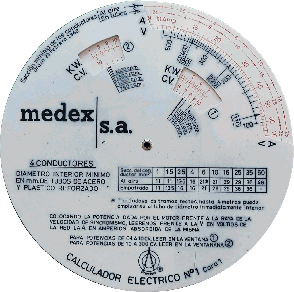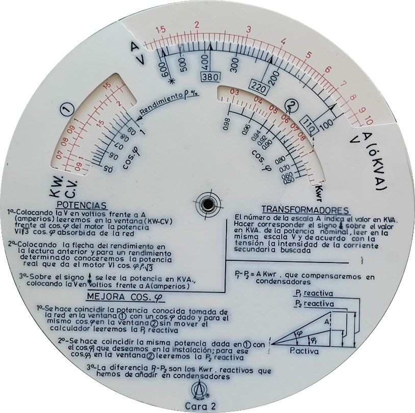 | Escalas: | Anverso: (sección cable al aire), (en tubos), (amperios) // (voltios) /// (kW), (cv) /// (kW), (cv) Reverso: (amperios) // (voltios) /// (kW), (cv) // (cosφ) // (kWr) // (cosφ) |